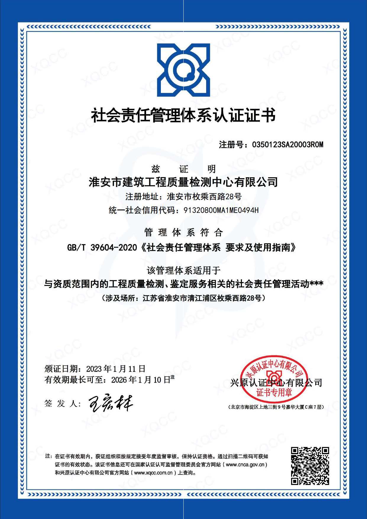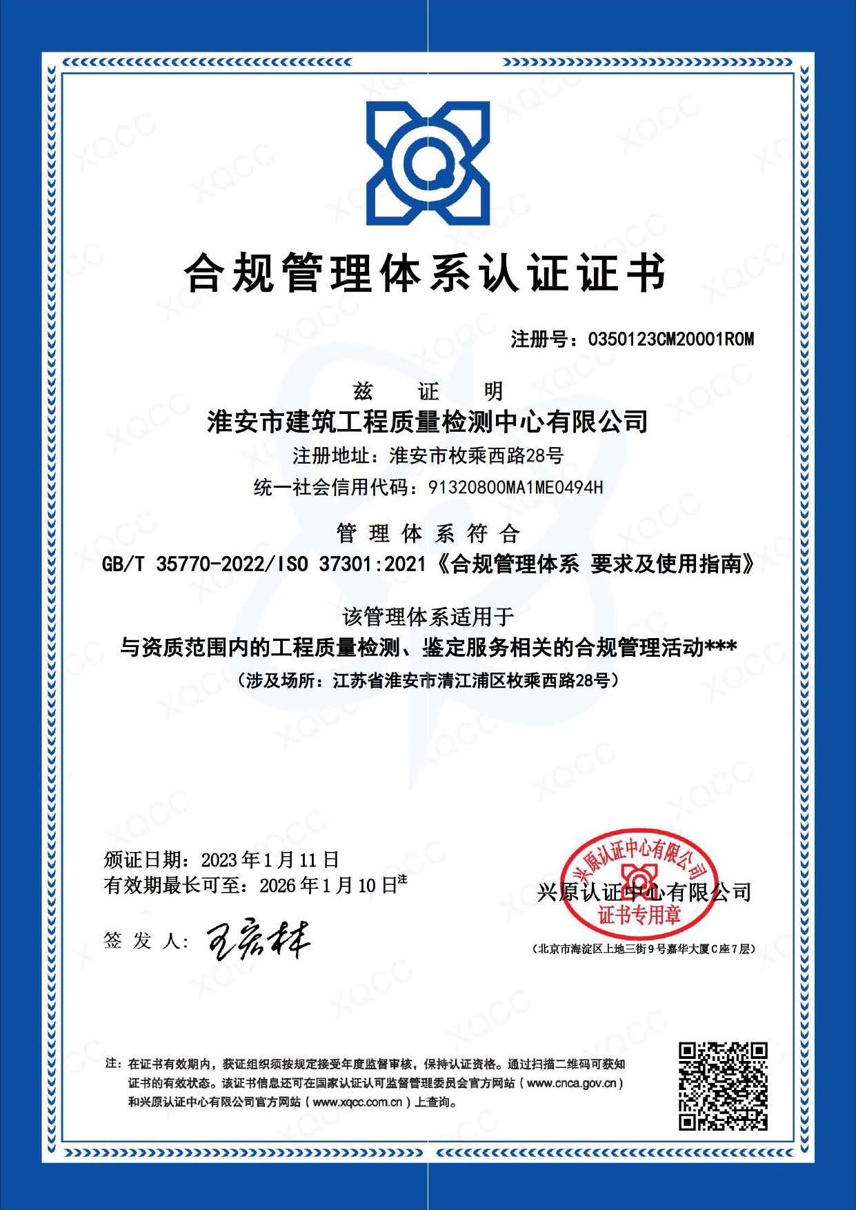 近期,淮安市建筑工程質(zhì)量檢測中心成功通過企業(yè)合規(guī)管理、誠信管理、社會責(zé)任管理體系認(rèn)證。